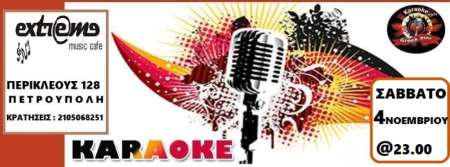 Έρχεται………….μια ακόμη βραδιά Karaoke με τρελό κέφι, πολύ τραγούδι και ξέφρενο χορό……… Κάντε τις πρόβες σας και ελάτε το Σάββατο 4 Νοεμβρίου στο Extreme Cafe Κρατήσεις στο: 210-5068251 Ώρα:23.00 Ημέρα:Σάββατο 4 Νοεμβρίου