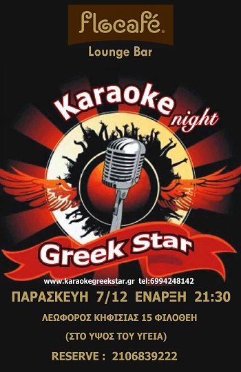 KARAOKE PARTY SHOW DJ MIX ΠΑΡΑΣΚΕΥΗ 7-12-12 ΣΤΟ (FLOCA CAFE LOUNGE BAR ΦΙΛΟΘΕΗΣ) ΩΡΑ ΕΝΑΡΞΗΣ 21.30 ΛΕΩΦΟΡΟΣ ΚΗΦΙΣΙΑΣ 15 ΦΙΛΟΘΕΗ (ΣΤΟ ΥΨΟΣ ΤΟΥ ΥΓΕΙΑ) RESERVE:(210 6839222) ΔΕΙΤΕ ΧΑΡΤΗ ΠΟΥ ΝΑ ΜΑΣ ΒΡΕΙΤΕ