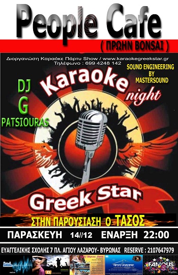 ΚΑΡΑΟΚΕ ΠΑΡΤΥ DJ MIX ΣΤΟ “PEOPLE CAFE”(ΠΡΩΗΝ BONSAI)ΠΑΡΑΣΚΕΥΗ 14/12/12 ΩΡΑ ΕΝΑΡΞΗΣ 22.00, ΕΥΑΓΓΕΛΙΚΗΣ ΣΧΟΛΗΣ 7 ΠΛ.ΑΓΙΟΥ ΛΑΖΑΡΟΥ-ΒΥΡΩΝΑΣ RESERVE (210 7647979) ΔΕΙΤΕ ΧΑΡΤΗ ΠΟΥ ΝΑ ΜΑΣ ΒΡΕΙΤΕ