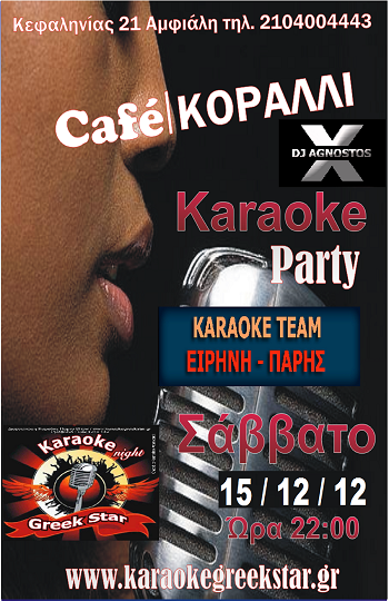 ΚΑΡΑΟΚΕ ΠΑΡΤΥ SHOW DJ ΜΙΧ ΣΑΒΒΑΤΟ 15/12/2012 ΘΑ ΕΙΜΑΣΤΕ ΣΤΟ”ΚΟΡΑΛΛΙ ΚΑΦΕ”ΣΤHN ΑΜΦΙΑΛΗ,ΚΕΦΑΛΗΝΙΑΣ 21 ΑΜΦΙΑΛΗ RESERVE (210 4004443) ΩΡΑ ΕΝΑΡΞΗΣ 22.00, ΔΕΙΤΕ ΧΑΡΤΗ ΠΟΥ ΝΑ ΜΑΣ ΒΡΕΙΤΕ