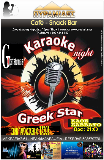 KARAOKE PARTY SHOW ΣΑΒΒΑΤΟ 1/12/12 ”ΠΥΡΑΜΙΔΕΣ CAFE SNACK BAR” ΔΕΚΕΛΕΙΑΣ 61 Ν. ΦΙΛΑΔΕΛΦΕΙΑ RESERVE 6985797761 ΔΕΙΤΕ ΧΑΡΤΗ ΠΟΥ ΝΑ ΜΑΣ ΒΡΕΙΤΕ