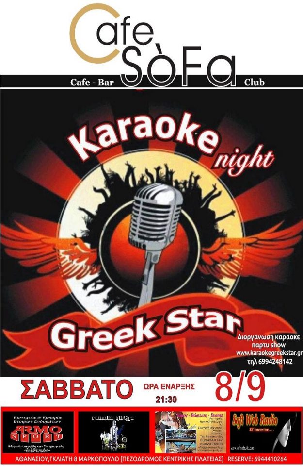 KARAOKE PARTY ΣΑΒΒΑΤΟ 31/3 ΕΛΑΤΕ ΝΑ ΤΡΑΓΟΥΔΗΣΟΥΜΕ LIVE ΣΤΟ KARAOKE PARTY TOY SOFA CAFEΑΘΑΝΑΣΙΟΥ, ΓΚΛΙΗ 8 ΜΑΡΚΟΠΟΥΛΟ [ΠΕΖΟΔΡΟΜΟΣ ΚΕΝΤΡΙΚΗΣ ΠΛΑΤΕΙΑΣ] RESERVE 6944410264 Δείτε χάρτη