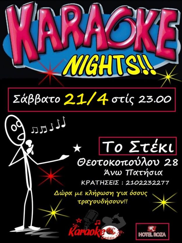 Έχεις βαρεθεί να πηγαίνεις στα μπαρ και απλά να κάθεσαι έχοντας εξαντλήσει όλα τα θέματα συζήτησης με την παρέα σου; Θες στην τελική να δοκιμάσεις τις φωνητικές σου ικανότητες αλλά δεν έχεις τα κότσια να δηλώσεις συμμετοχή στο The Voice; Σου ’χουμε τη λύση. Δοκίμασε μια βραδιά karaoke…….. ΣΑΒΒΑΤΟ 14/4 www.karaokegreekstar.gr